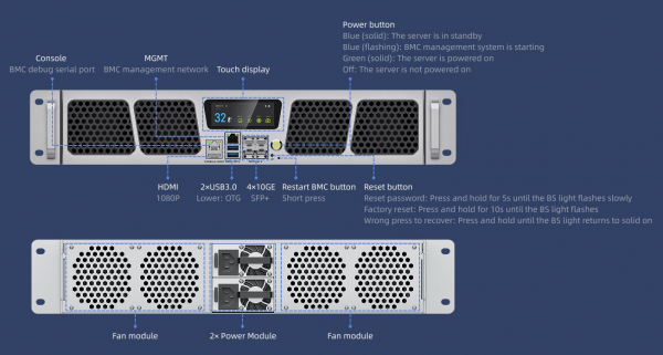 ・ ネットワーク:10GbE SFP+×4、GbE(BMC管理)×1、USB3.0×2、HDMI(BMC表示)などを装備