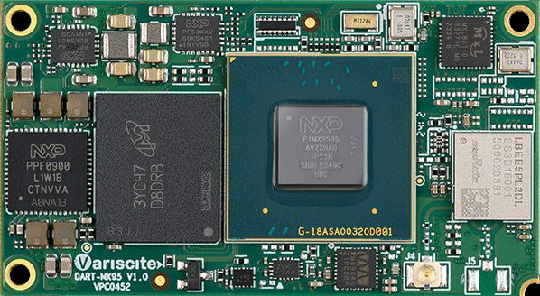 DART-MX95は、NXPのi.MX 95システムオンチップ(SoC)を基盤としており、最大2GHzで動作する6つのArm Cortex-A55コア、800MHzのCortex-M7コア、333MHzのCortex-M33コアに加え、機械学習ワークロードを高速処理するeIQ Neutron NPUアクセラレータと最大16GBのLPDDR5メモリを備えています。3Dおよび2Dグラフィックスを加速するプロセッサを搭載し、最大4K解像度(30fps)または3840×1440p60のMIPI DSI出力、および1080p60の2つのLVDS出力に対応しています。
