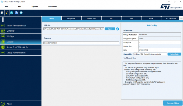 ・ OBK生成手順(抜粋):STM32 Trusted Package CreatorでDA_ConfigWithPassword.xmlを用い、任意パスワードで.OBKを生成(H7Rx使用時は暗号化無効化の調整が必要)