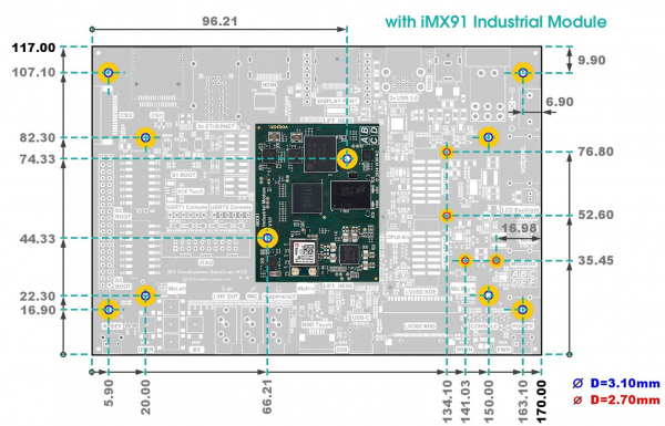 機構寸法:117.0 × 170.0 × 25.30 mm(iMX91搭載時)。iMX8M + ヒートシンク構成では31.93 mmの高さ参考値も記載。取り付け穴径:φ3.10 mm/φ2.70 mm(図示)。